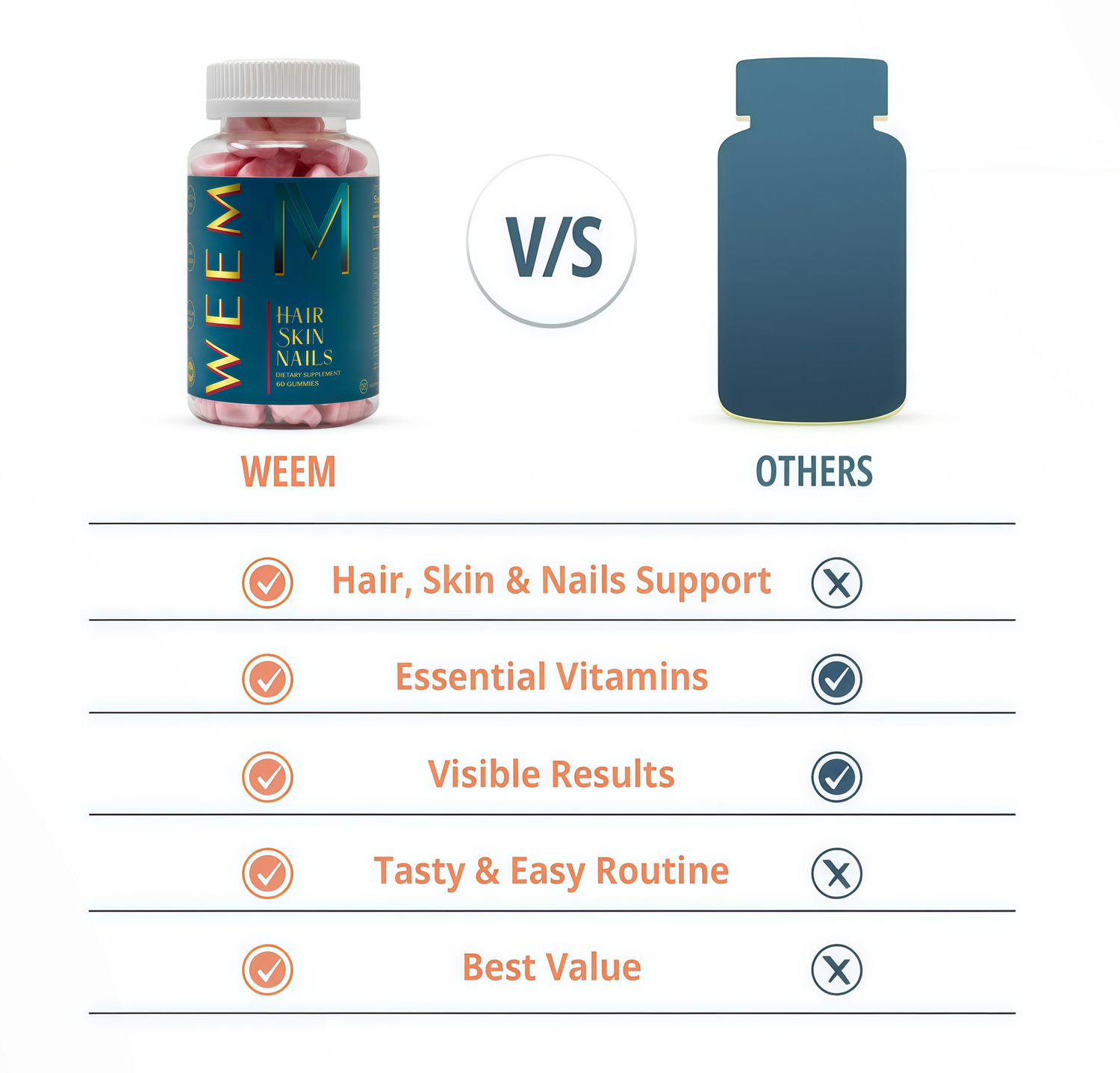 Most gummies focus on taste alone. Weem Hair Vitamin Gummies combines great taste with a science-backed formula designed to support healthier hair, glowing skin, and stronger nails—consistently and effectively.