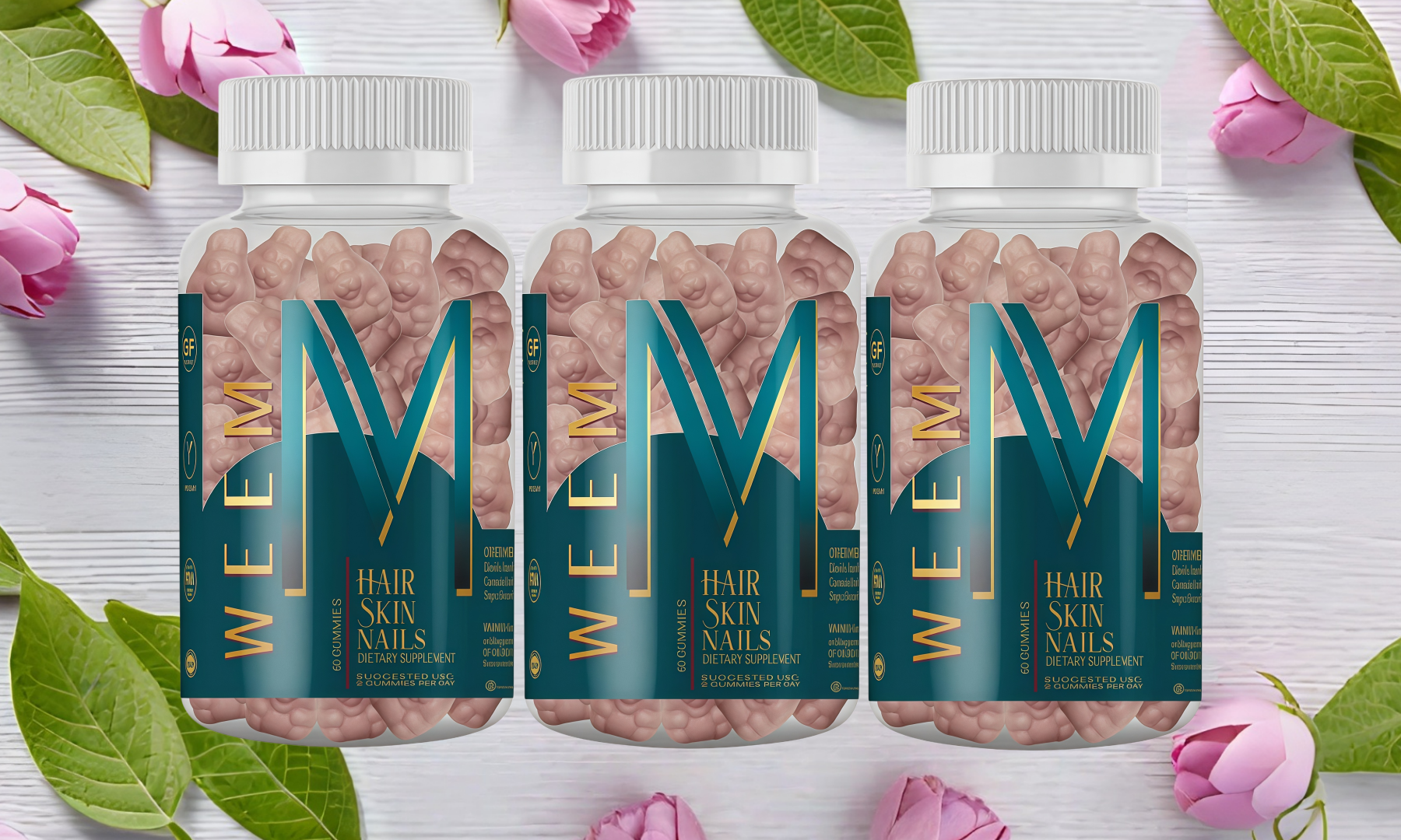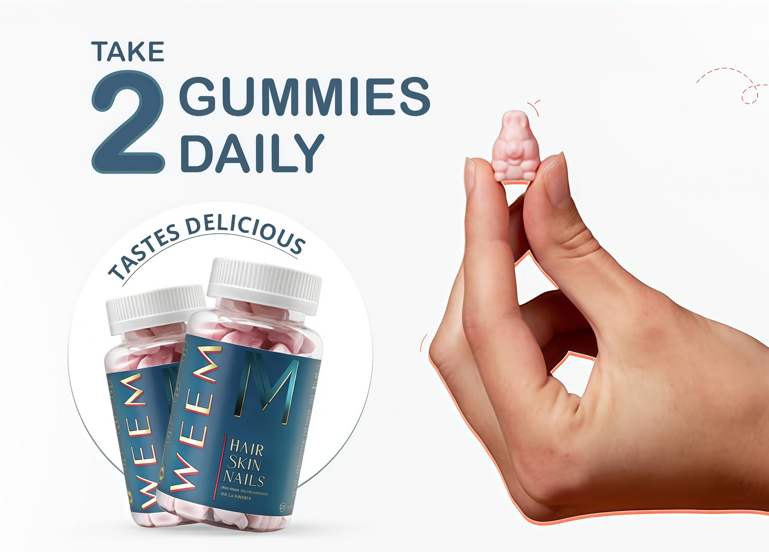Weem Gummies for hair, Skin, & Nails support stronger hair, healthier and more radiant skin, with nails growing naturally, using our Hair Vitamins Gummies—benefits from Weem Hair Skin & Nails vitamins in a delicious, easy-to-take Gummy.