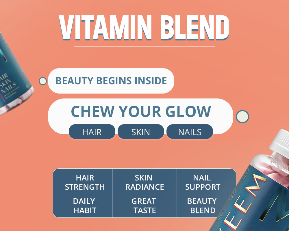 Boost yourinner and outer beautywithWEEM Hair, Skin, and Nails Gummies, adelicious, easy-to-take supplementpacked withessential vitamins and biotintosupport healthy hair growth, strong nails, and radiant skin. Formulated withVitamins A, C, E, B5, B6, B9, and Biotin, thisall-in-one beauty supplementnourishes your body from the inside out, promotingcollagen production, antioxidant protection, and cellular health.
